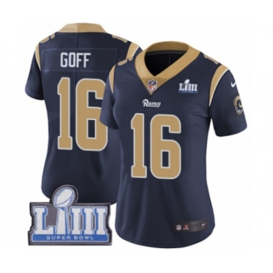 >Women's Nike Los Angeles Rams #16 Jared Goff Navy Blue Team Color Vapor Untouchable Limited Player Super Bowl LIII Bound NFL Jersey