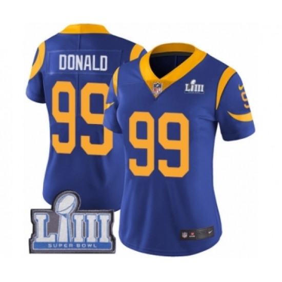 >Women's Nike Los Angeles Rams #99 Aaron Donald Royal Blue Alternate Vapor Untouchable Limited Player Super Bowl LIII Bound NFL Jersey