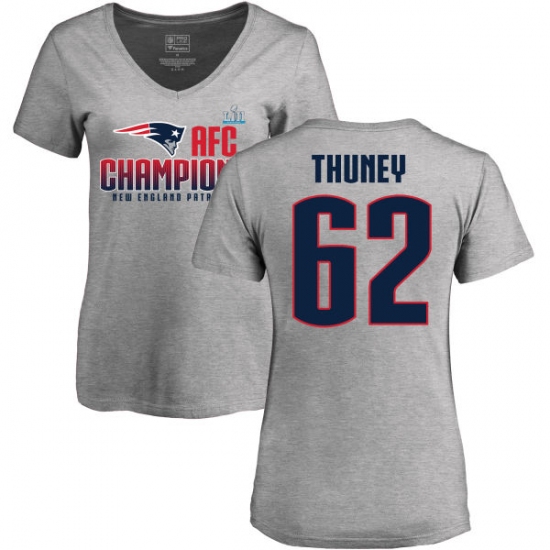 >Women's Nike New England Patriots #62 Joe Thuney Heather Gray 2017 AFC Champions V-Neck T-Shirt