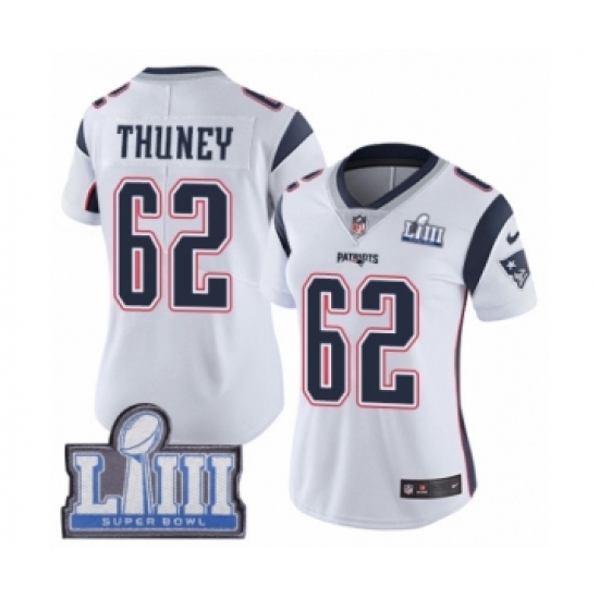 >Women's Nike New England Patriots #62 Joe Thuney White Vapor Untouchable Limited Player Super Bowl LIII Bound NFL Jersey