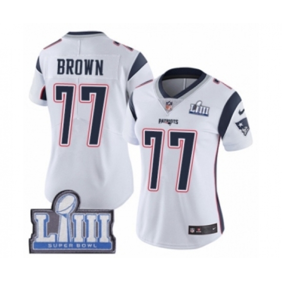 >Women's Nike New England Patriots #77 Trent Brown White Vapor Untouchable Limited Player Super Bowl LIII Bound NFL Jersey