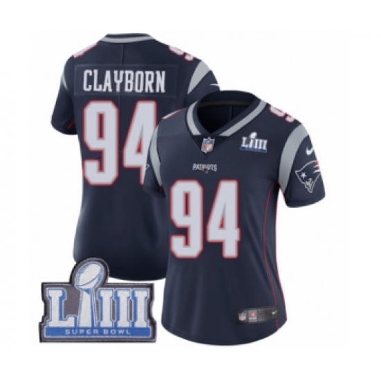 >Women's Nike New England Patriots #94 Adrian Clayborn Navy Blue Team Color Vapor Untouchable Limited Player Super Bowl LIII Bound NFL Jersey