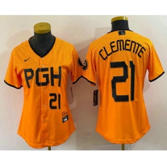 >Women's Pittsburgh Pirates #21 Roberto Clemente Number Yellow 2023 City Connect Stitched Jersey