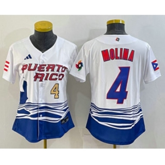 >Womens Puerto Rico Baseball #4 Yadier Molina Number 2023 Red World Classic Stitched Jersey