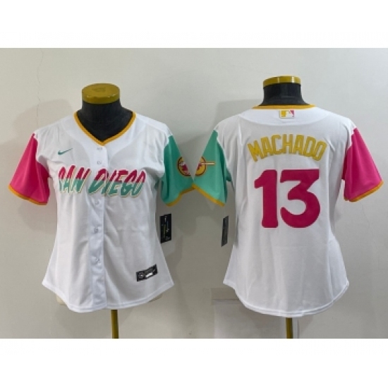 >Women's San Diego Padres #13 Manny Machado White 2022 City Connect Cool Base Stitched Jersey