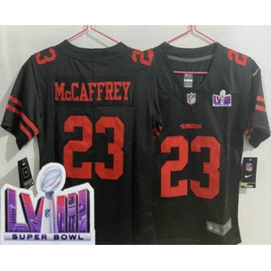 >Women's San Francisco 49ers #23 Christian McCaffrey Limited Black LVIII Super Bowl Vapor Jersey