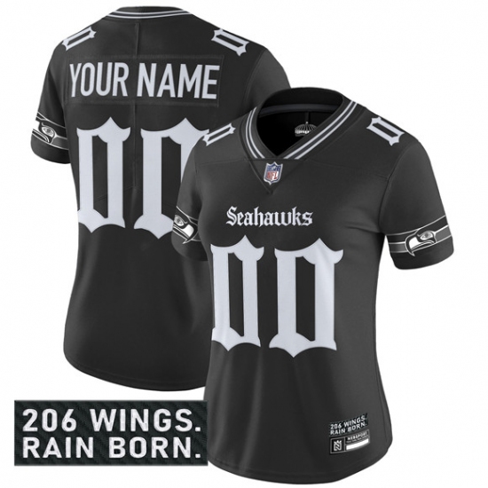 >Women's Seattle Seahawks Active Player Custom Black 2025 F.U.S.E. 'Gothic Rain City Shadows Edition' Vapor Untouchable Limited Football Stitched Jersey