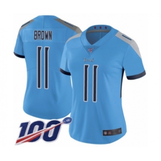 >Women's Tennessee Titans #11 A.J. Brown Light Blue Alternate Vapor Untouchable Limited Player 100th Season Football Jersey