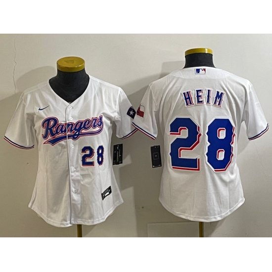 >Women's Texas Rangers #28 Jonah Heim Number White 2023 World Series Champions Cool Base Jersey