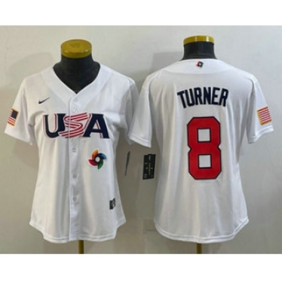 Women's USA Baseball #8 Trea Turner 2023 White World Classic Stitched Jersey