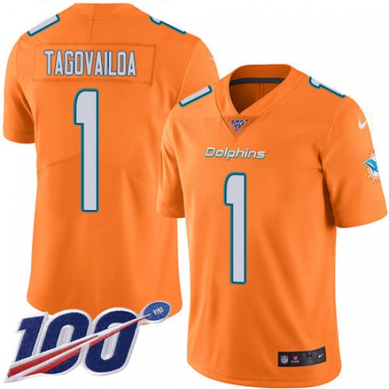 >Youth Miami Dolphins #1 Tua Tagovailoa Orange Stitched Limited Rush 100th Season Jersey