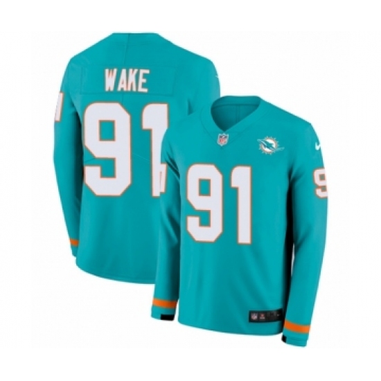 >Youth Nike Miami Dolphins #91 Cameron Wake Limited Aqua Therma Long Sleeve NFL Jersey
