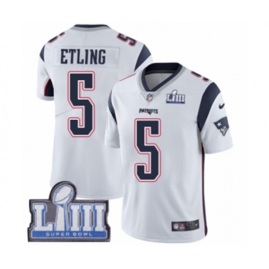 >Youth Nike New England Patriots #5 Danny Etling White Vapor Untouchable Limited Player Super Bowl LIII Bound NFL Jersey