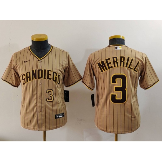 >Youth San Diego Padres #3 Jackson Merrill Tan 2023 Cool Base Stitched Jerseys